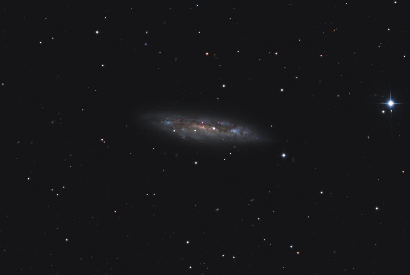 Messier 82 (M82) is also known as NGC 3034 or the Cigar Galaxy and is a starburst galaxy approximately 12 million light-years away in the constellation Ursa Major. M82 is a member of the M81 Group and is about five times more luminous than our Milky Way Galaxy. It has a centre one hundred times more luminous than our Milky Way. We look at it as an edge on view so it is not quite as impressive as M81.
