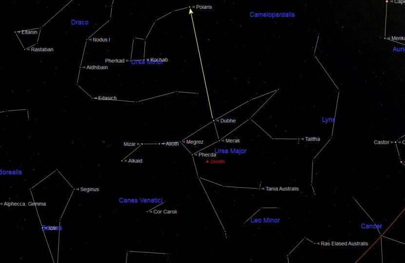 Our planet Earth rotates around the North Celestial Pole once a day (24 hours). If we look straight up to the Zenith we can see that as Earth rotates the sky appears to rotate clockwise around Polaris above us. As the sky appears to rotate, Ursa Major and the other constellations will appear to move around the North Celestial Pole in an east to west direction. Ursa Major will appear to move clockwise around Polaris as shown on the chart above (saucepan handle behind). The movement is slow and not perceivable in real time.