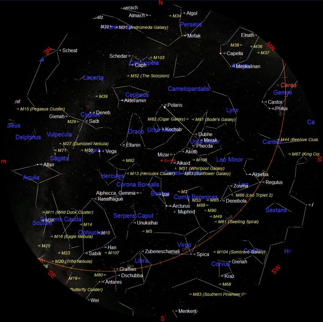 The chart above shows the night sky looking south at about 22:00 BST on 15th June. West is to the right and east to the left. The point in the sky directly overhead is known as the Zenith and is shown (in red) at the upper centre of the chart. The curved brown line across the sky at the bottom is the Ecliptic or Zodiac. This is the imaginary line along which the Sun, Moon and planets appear to move across the sky. The brightest stars often appear to form a group or recognisable pattern; we call these ‘Constellations'.