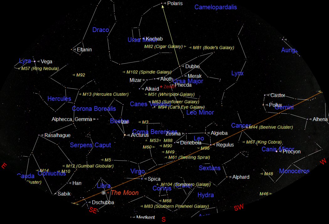 The chart above shows the night sky looking south at about 22:00 BST on 15th May. West is to the right and east to the left. The point in the sky directly overhead is known as the Zenith and is shown (in red) at the upper centre of the chart. The curved brown line across the sky at the bottom is the Ecliptic or Zodiac. This is the imaginary line along which the Sun, Moon and planets appear to move across the sky. The brightest stars often appear to form a group or recognisable pattern; we call these ‘Constellations'.