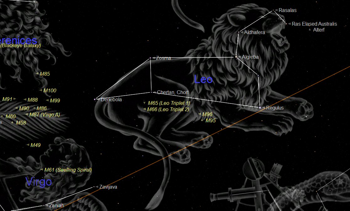 This time of the year is regarded as the season of galaxies and Leo is on the edge of a large group of galaxies called the ‘Virgo Cluster'. The main group is located in the neighbouring constellations of Virgo and Coma Berenices to the east (left) of Leo. However Leo does have four lovely bright galaxies of its own, these are known as: M65, M66, M95 and M96. They are marked in yellow on the chart above just below the ‘lion'. The galaxies in and around Leo do require a medium sized telescope and a dark unpolluted sky to see well.