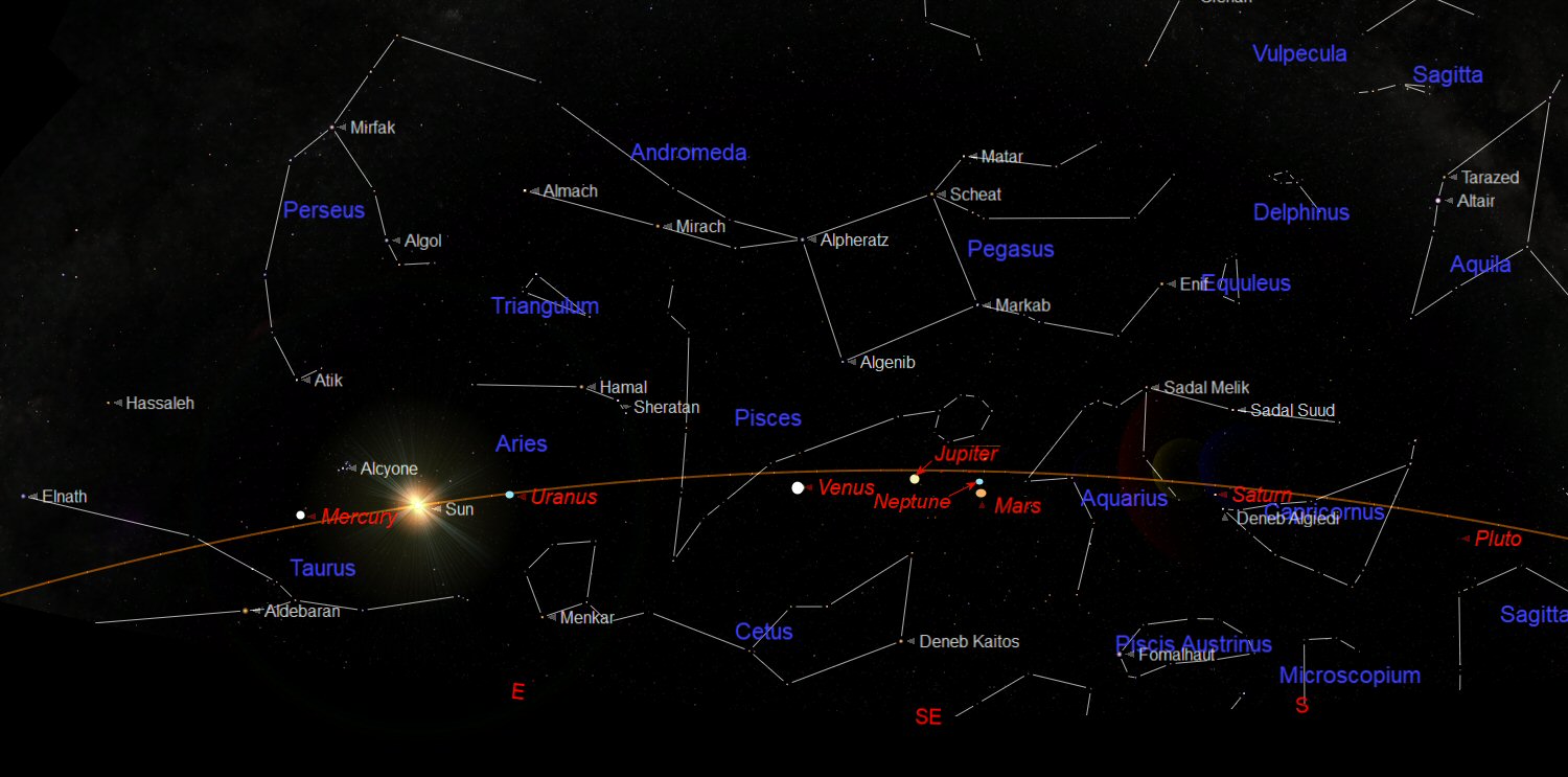 The chart above shows the location of the planets along the Ecliptic in the morning sky. The sky has been darkened to make the planets visible. The planets are: (in order as they appear before sunrise) Saturn, Mars, Venus Neptune and Jupiter. They are visible along the Elliptic from the West (right) to East (left). Mercury and Uranus appear close to Sun after it sets over the western horizon in the evening. The planets appear low in the sky, in the bright morning or evening sky so are not well positioned for observing.