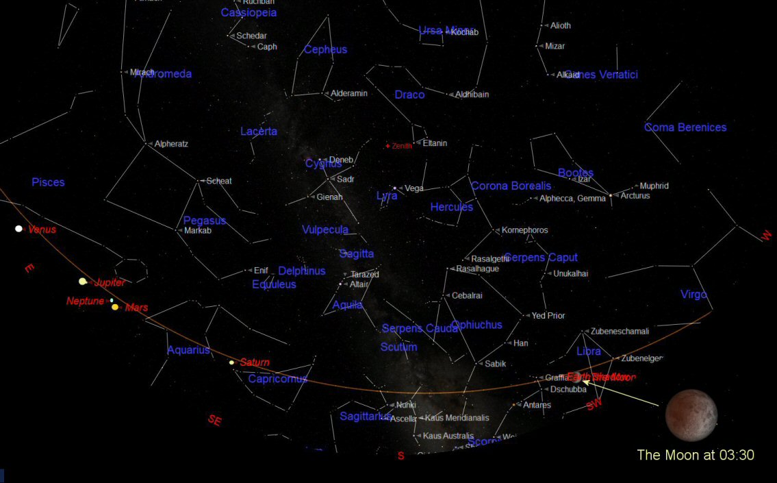 Although the Lunar Eclipse will be over for us by 05:00 it will be seen in its entirety in the USA. However for those of us in the UK who have braved the early morning cold there could be an early morning treat while the eclipse is progressing. Most of the planets will be rising over the eastern horizon before the Sun rises. While the Lunar Eclipse is developing on the western horizon the planets will be rising over the eastern horizon. The planets rise at: Saturn (02:30), Mars (03:30), Neptune (03:30), Jupiter (03:40) and Venus (04:00).