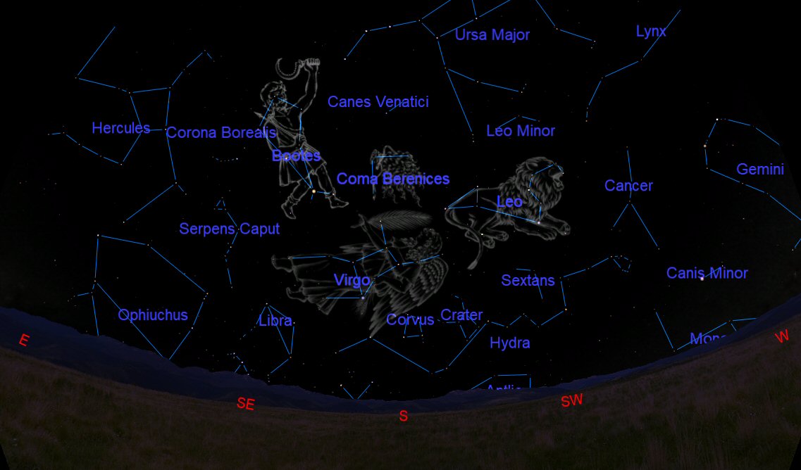 The constellation of Virgo (the Virgin) can be seen at the lower east (left) of the chart above. To the north (above) and between Virgo and Leo is the fainter constellation of Coma Berenices (the hair of Berenices).