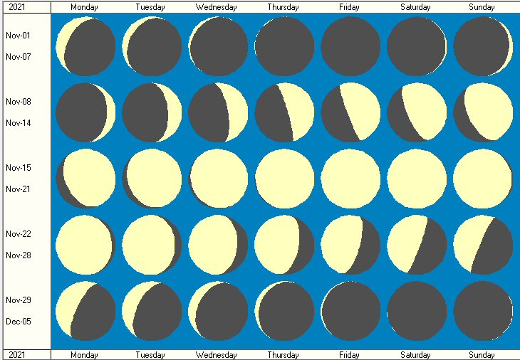 The chart above shows the phases of the Moon during the month of November 2021. But to follow the phases we need to know where the Moon will be in the sky during the month. So let's start with the New Moon and where to look for it.