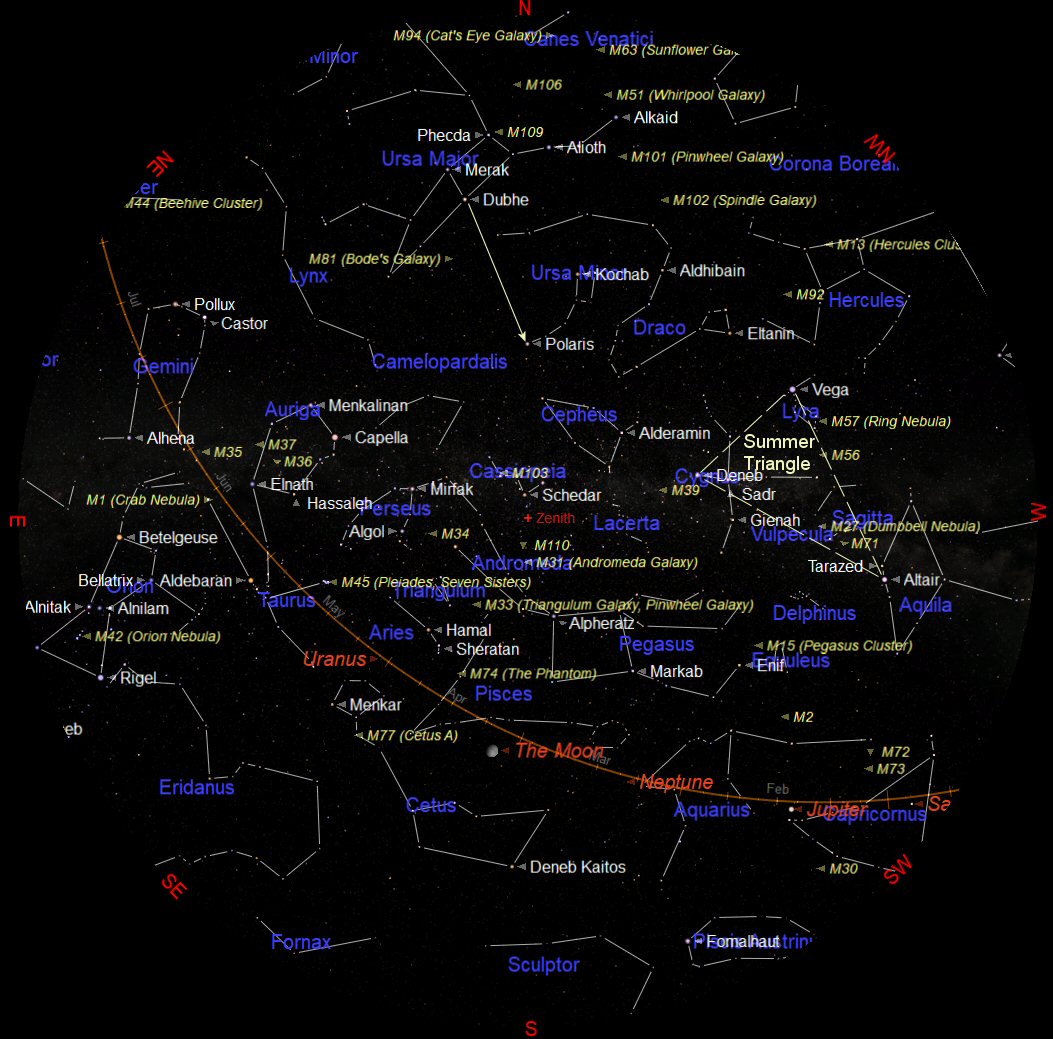 Constellations through which the ecliptic passes this month are: Sagittarius (the Archer), Capricornus (the Goat), Aquarius (the Water Carrier), Pisces (the Fishes), Aries (the Ram) and Taurus (the Bull).