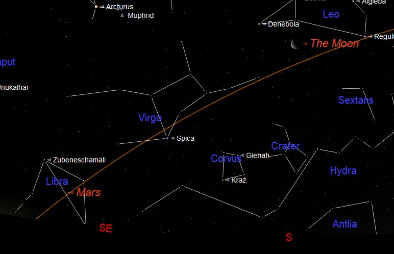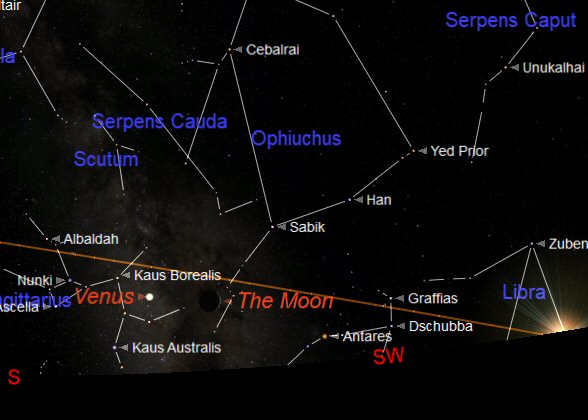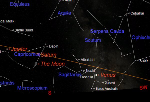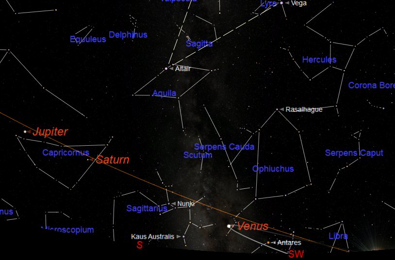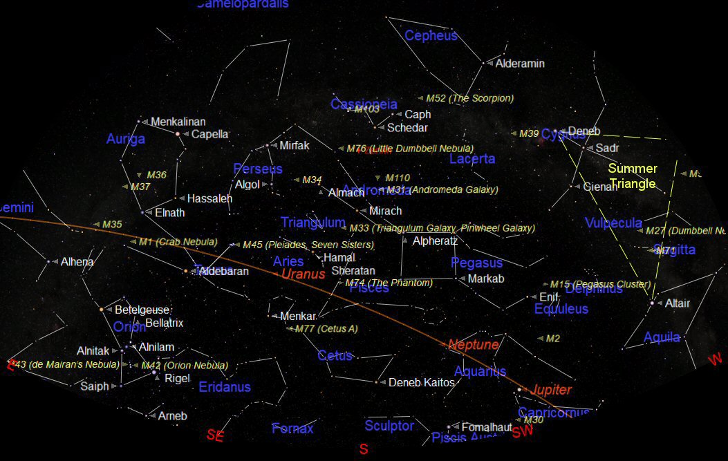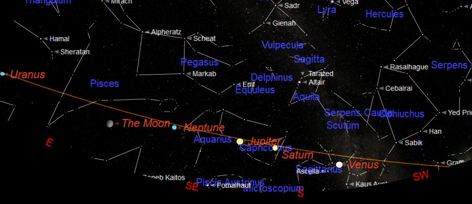 The chart above shows the location of the planets along the Ecliptic. The sky has been darkened to make the planets visible. The visible planets: Venus, Saturn, Jupiter, Neptune and Uranus are visible along the Elliptic from the West (right) to East (left). The planets appear low in the sky and are not well positioned for observing.