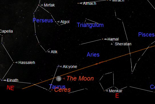 Coming into view in the south east is the constellation of Taurus (the Bull). The most obvious star in Taurus is the lovely Red Giant Star called Aldebaran. It appears slightly orange to the ‘naked eye' but it is very obviously orange when seen using binoculars or a telescope. Aldebaran is located at the centre of the ‘flattened' X shape formed by the brightest stars in Taurus. At the end of the top right (upper west) arm of the ‘X' is the beautiful ‘naked eye' Open Star Cluster Messier 45 (M45) known as the Pleiades (or the Seven Sisters). It really does look magnificent using binoculars.