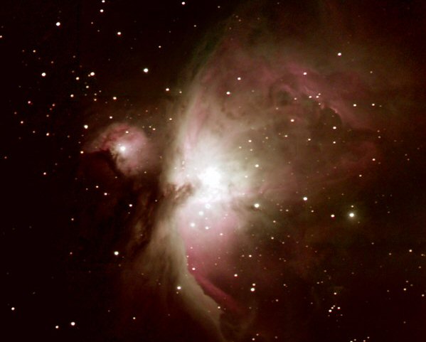 A small telescope will show a larger view and some detail in M42. Structure in the nebula can be seen with parts of the nebula illuminated and other parts appearing dark.
