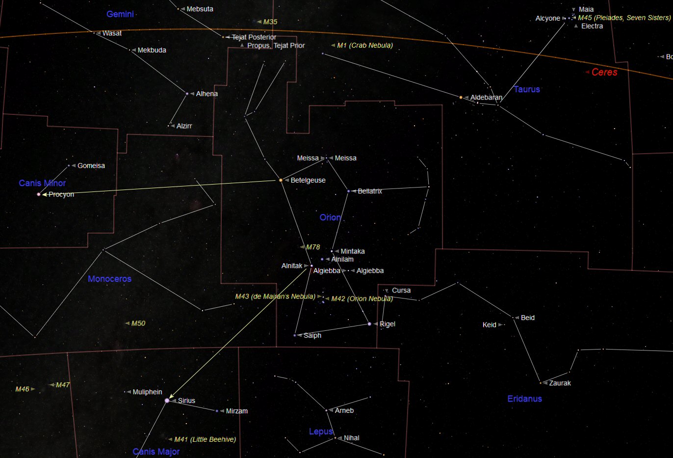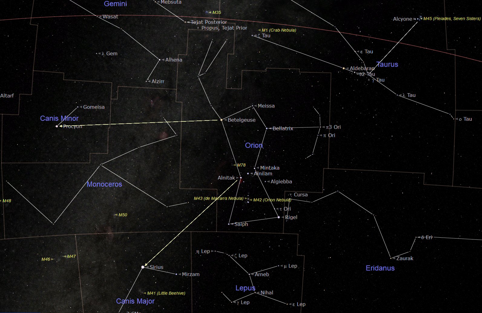 To the south of Taurus is the winter constellation of Orion (the Hunter). Orion is easily found by looking for his very obvious three stars of his belt. Orion has his Hunting Dogs Sirius (the big dog) and Procyon (the little dog) to the east (left) and following him.