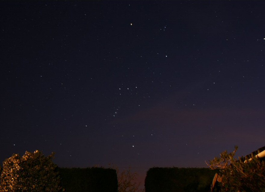 Above and between his shoulders is a little group of stars that mark out the head. From his right shoulder (the star Bellatrix) he holds out a shield. From his left shoulder (the star Betelgeuse) a club is held above his head. It almost looks as if Orion is fending off the charge of the great bull Taurus who is located above and to the west (right) of Orion.