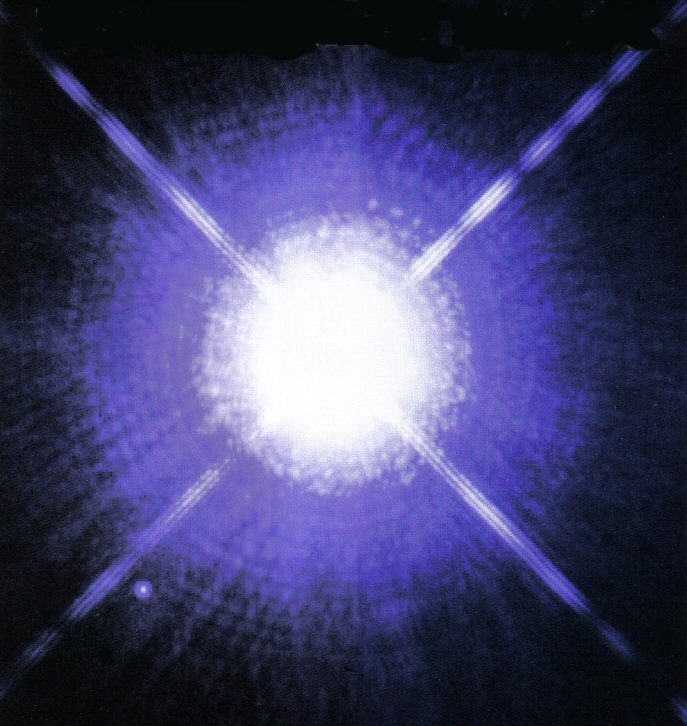 The picture above was taken by the Hubble Space Telescope with a camera that has a special mask to reduce the glare of Sirius A. Sirius B can be seen to the lower left as a small white dot. Sirius B cannot be seen using any normal amateur's telescope.