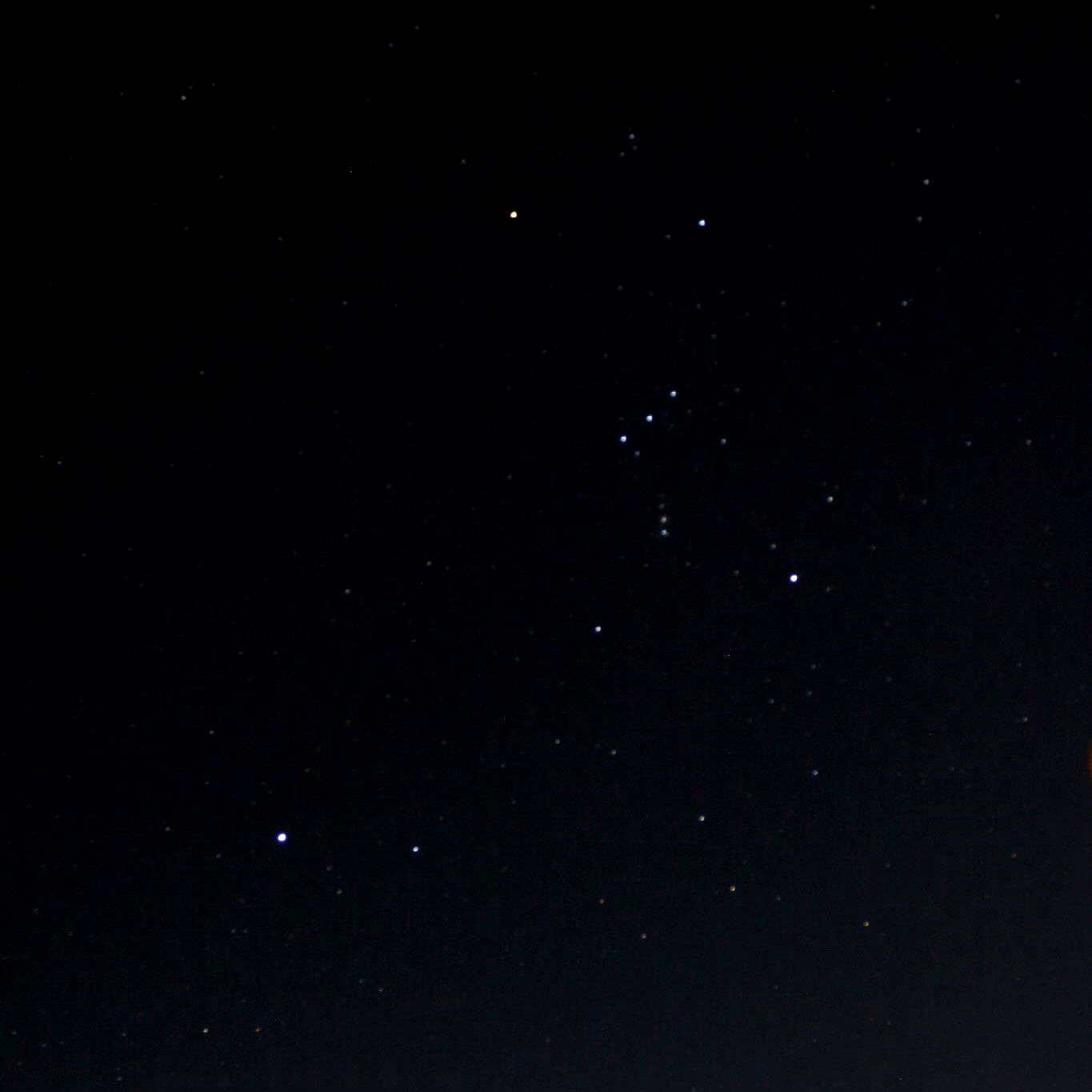 Orion is one of the few constellations that does look (with a little imagination) like what it is named after. The most obvious feature is the line of three stars, called Alnitak, Alnilam and Mintaka that make up Orion's belt. From his belt we can see two bright stars called Saiph and Rigel below. These define the bottom of his ‘skirt like' tunic. Above the belt are two stars Betelgeuse and Bellatrix that denote the position of his shoulders.
