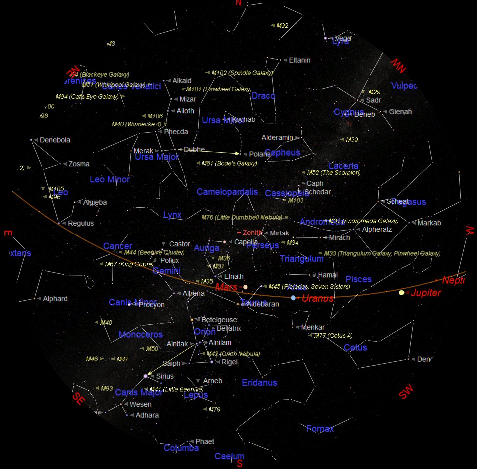 Following Taurus is the constellation of Gemini (the Twins). The two brightest stars in Gemini are Castor and Pollux and they are named after mythological twins. To the north of Taurus is the odd pentagon shape of Auriga (the Charioteer). Dominating Auriga is the brilliant white star Capella which is almost directly overhead. For those with a telescope there is a line of lovely open clusters to search out in Taurus and Auriga. These are M35 in Taurus and M36, M37 and M38 in Auriga.