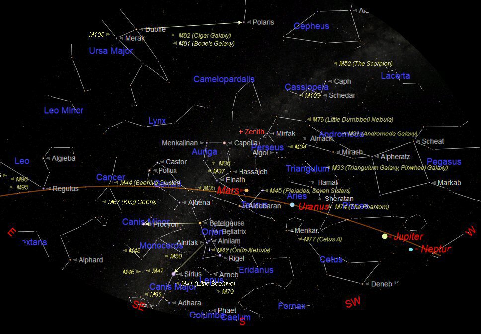 Constellations through which the ecliptic passes this month are: Aquarius (the Water Carrier), Pisces (the Fishes), Aries (the Ram), Taurus (the Bull), Gemini (the Twins), Cancer (the Crab) and Leo (the Lion).