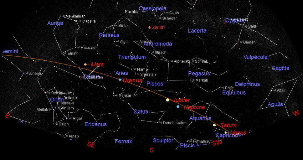 The chart above shows the night sky looking south at about 21:00 GMT on 15th January. West is to the right and east to the left. The point in the sky directly overhead is known as the Zenith and is shown (in red) at the upper centre of the chart. The curved brown line across the sky at the bottom is the Ecliptic or Zodiac. This is the imaginary line along which the Sun, Moon and planets appear to move across the sky. The brightest stars often appear to form a group or recognisable pattern; we call these ‘Constellations'.