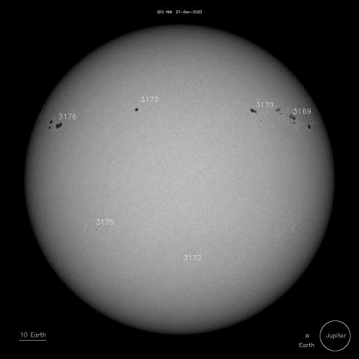 The Sun is about half way through its Active Phase when there is more activity on the surface. There is an 11 year cycle when the Sun increases and decreases activity on the surface. The most obvious change on the Sun is the appearance of Sunspots as shown on the image below. These and other activity is caused by the interaction of powerful magnetic fields in the Sun.